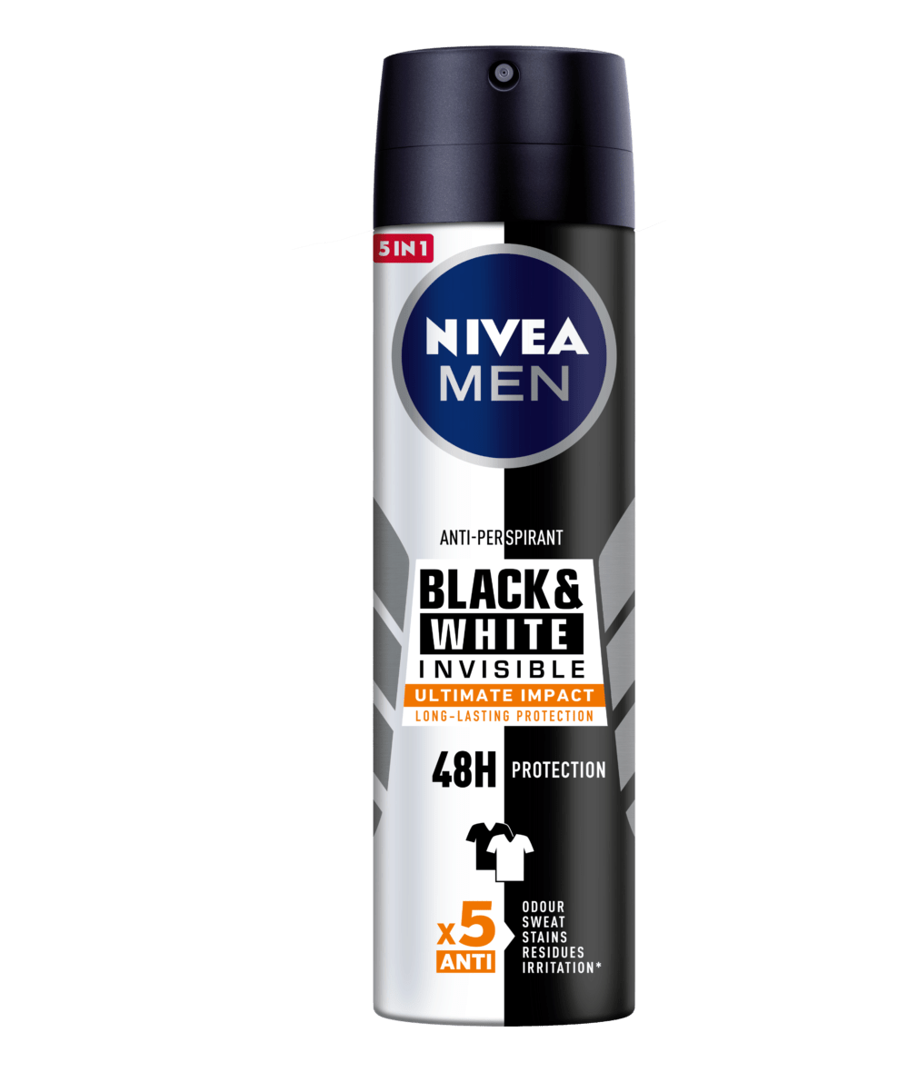 NIVEA MEN Black & White Ultimate Impact Deodorant with 5X Action that effective against stains, anti-sweat, anti-odor, anti-bacterial and long lasting masculine scent that provides long lasting protection.